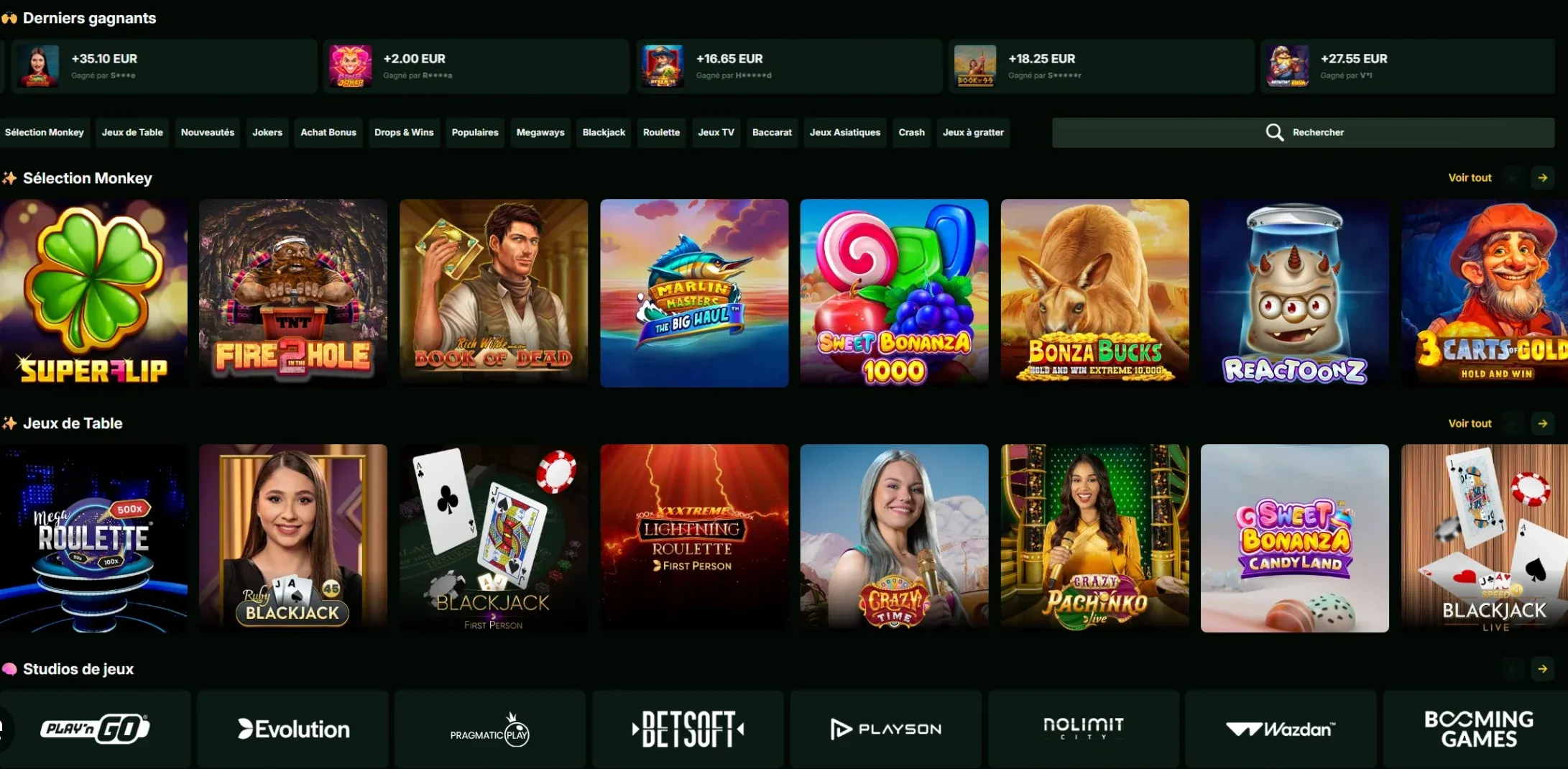 Comme son nom l'indique, SlotMonkey est le paradis des amateurs de machines à sous. Ce casino thématique et ludique cible les joueurs qui recherchent avant tout une immense variété de slots, des plus classiques aux plus innovantes, avec des bonus spécifiquement conçus pour eux.