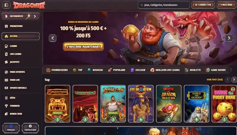 Dragonia est une plateforme récente (2024) qui a misé sur une ludothèque gargantuesque pour se démarquer. Avec plus de 11 000 jeux, il vise les joueurs passionnés qui aiment explorer et découvrir de nouvelles pépites. Son univers fantastique et son bonus non-sticky sont des arguments de poids.